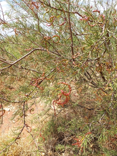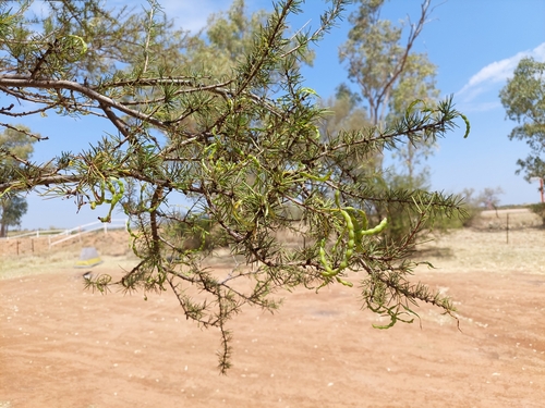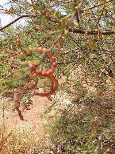 These bushes are very popular with noisy flocks of Corellas, just after sun up, here at Curtin Springs in the NT. Some bushes have green pods (the birds eat these), while others have drier, brown, pods.