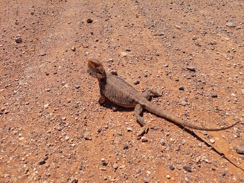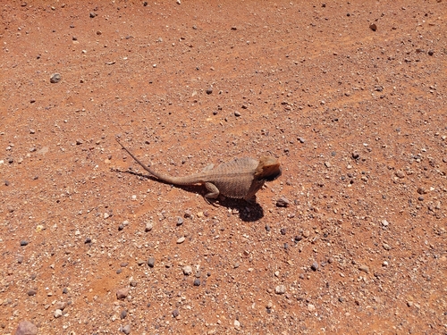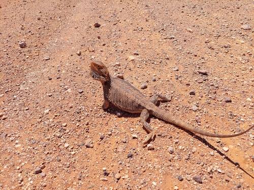 Silly creature was sitting sunning itself right in the path of oncoming traffic on the dirt road into the Kanku-Breakaways NP near Coober Pedy. I had to get out of the vehicle and literally shoo it off the road. After some persuasion it eventually scuttled off.