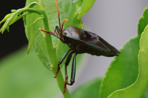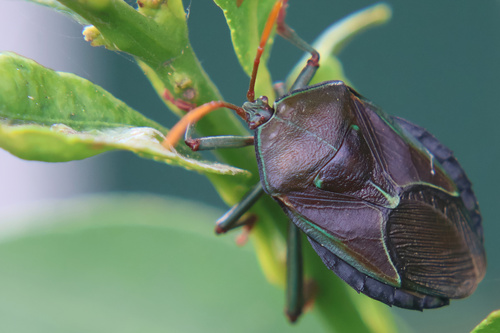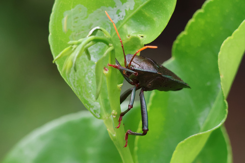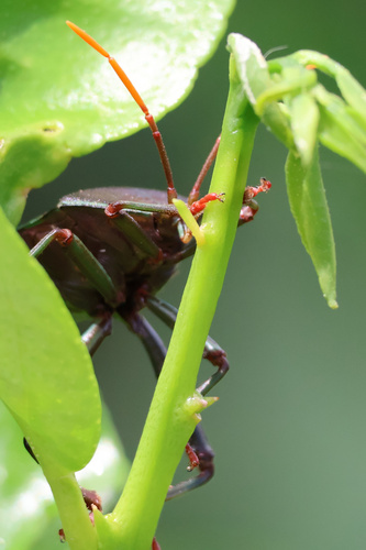 An unfortunate visitor to our young Lime trees. This pest will cause the young fruit to fall off, apparently. This ‘stinkbug’ can spray a noxious chemical, which can injure – and even temporarily blind people.