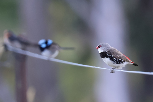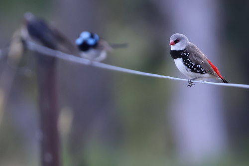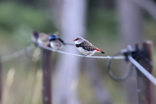 Diamond Firetail with two chums, just hanging out on the fence, up in the NSW tablelands.